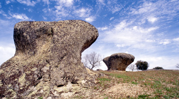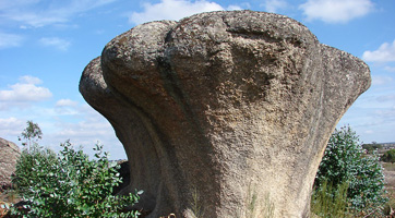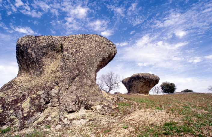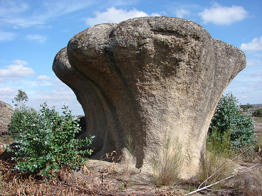 Os blocos pedunculados são como enormes cogumelos de granito que crescem aqui e além na Superfície de Aplanação do Alto Alentejo. A sua origem ocorreu em duas etapas: uma primeira que se dá após a exposição à superfície de uma porção granítica, resulta de uma mais rápida alteração química da rocha ao nível do solo, onde as águas subterrâneas se acumulam e enriquecem em ácidos orgânicos e uma segunda etapa desenvolvida durante um período de chuvas mais intensas em que os solos sofrem erosão acelerada, expondo o pedúnculo que une o todo coerente ao seu substrato granítico.